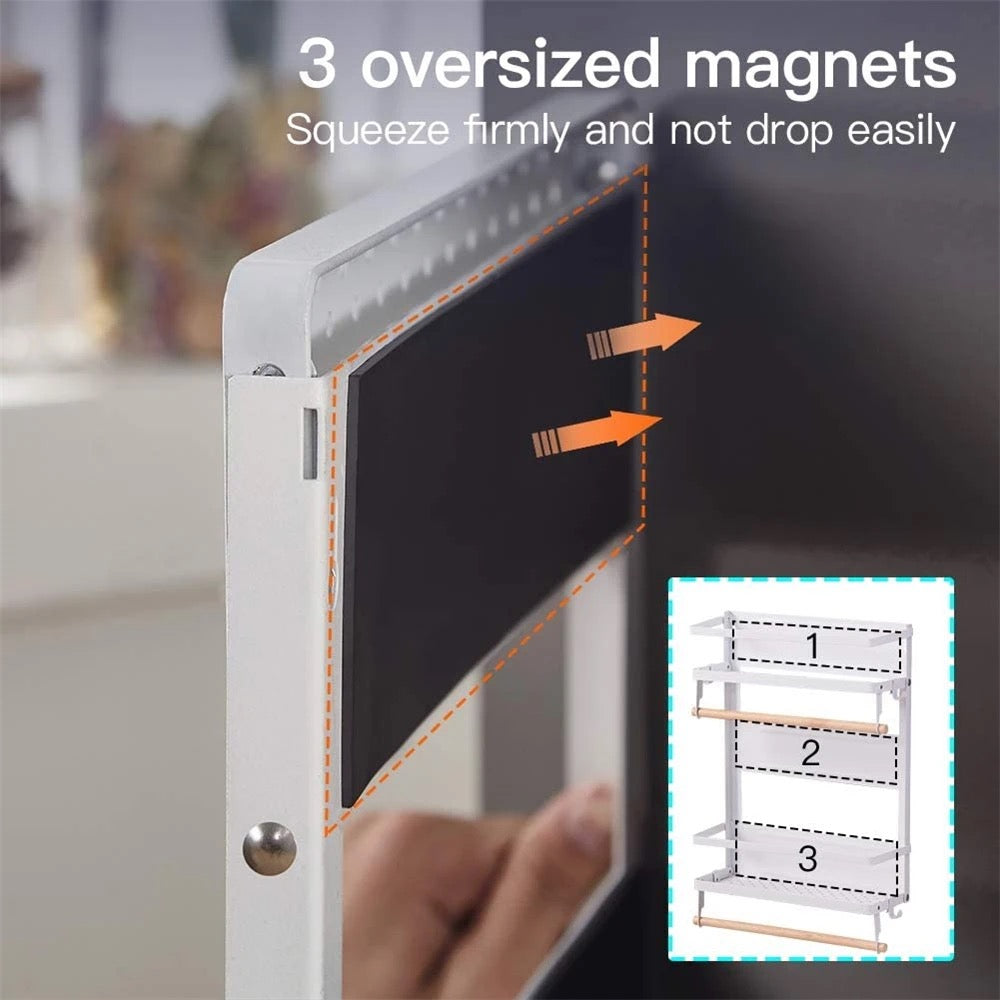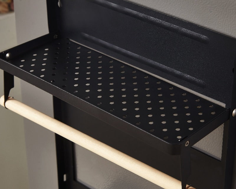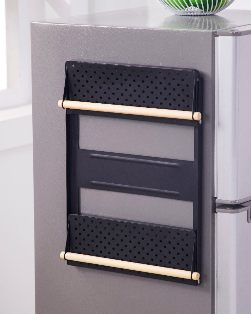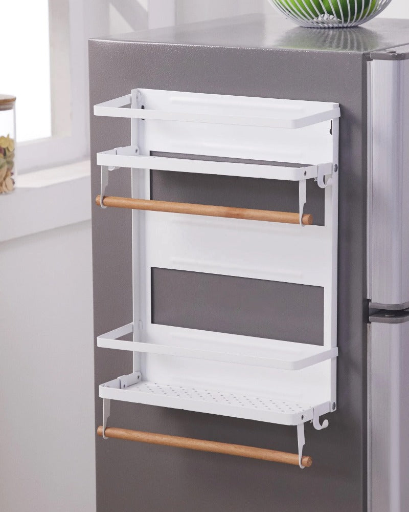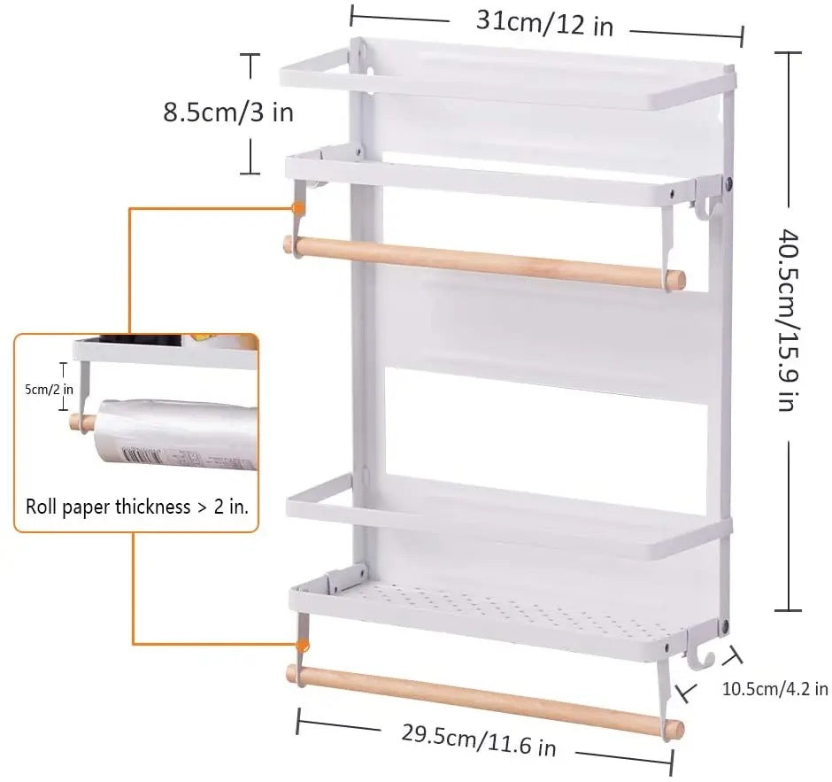 Make the most of your fridge! Don't let it go to waste! This practical kitchen rack utilizes the fridge surface, keeping frequently used items off the counter but within easy reach. Attach the strong magnet in seconds and store everything from paper towels to pot holders and hanging utensils. Access your most-used items conveniently.