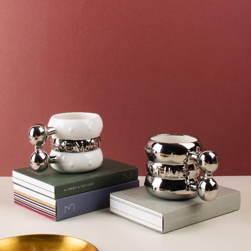 Get your caffeine fix with a twist! This Chrome Sphere Coffee Mug is crafted from durable ceramic for a unique drinking experience. Upgrade your morning routine with this quirky and playful addition to your kitchen. (Caffeine not included.)